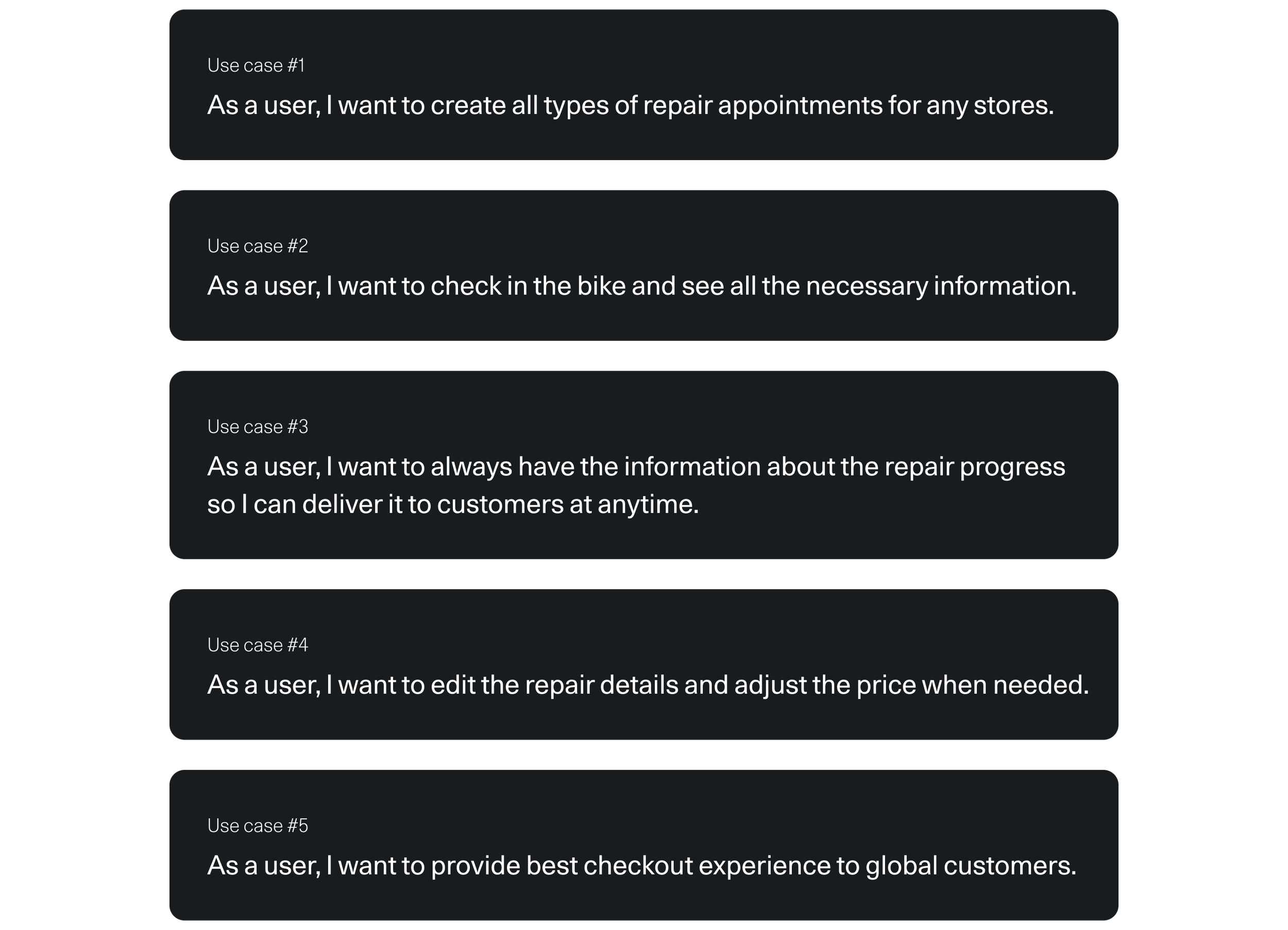 I created a dedicated retail user flow for the repair process, along with an experience map based on the full customer journey—covering riders, customer support, bike doctors, and retail users. From this, I identified four main phases: planning repair, bike drop-off, in repair, and bike delivery.
